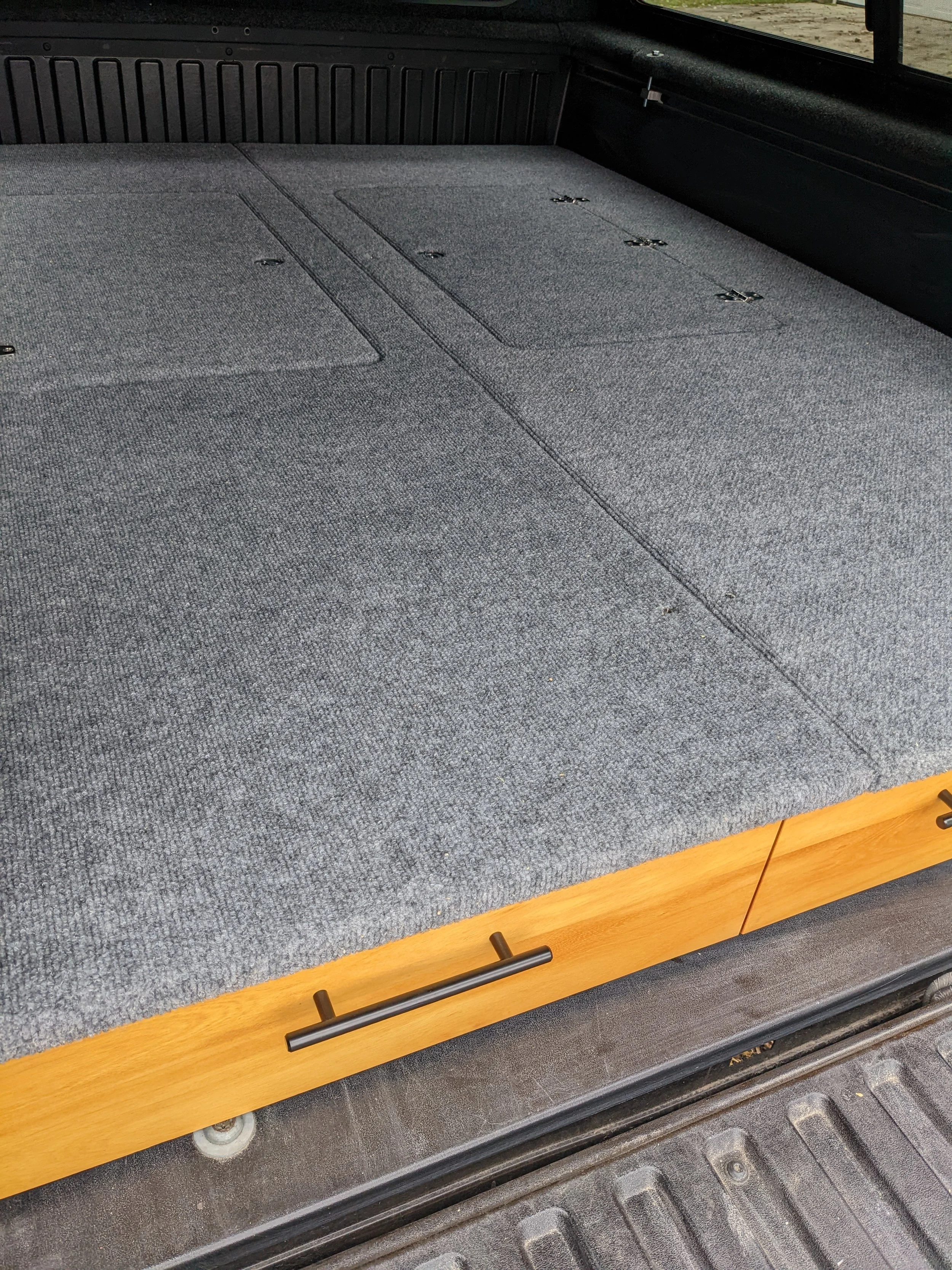 A geologist wanted a platform installed to be able to easily and comfortably sleep in the back of his truck. I added drawers and hatches to hide away gear and made the whole set up easily removable. Osage orange drawer fronts, stainless hinges and latches, carpet over plywood. Completed October 2022.