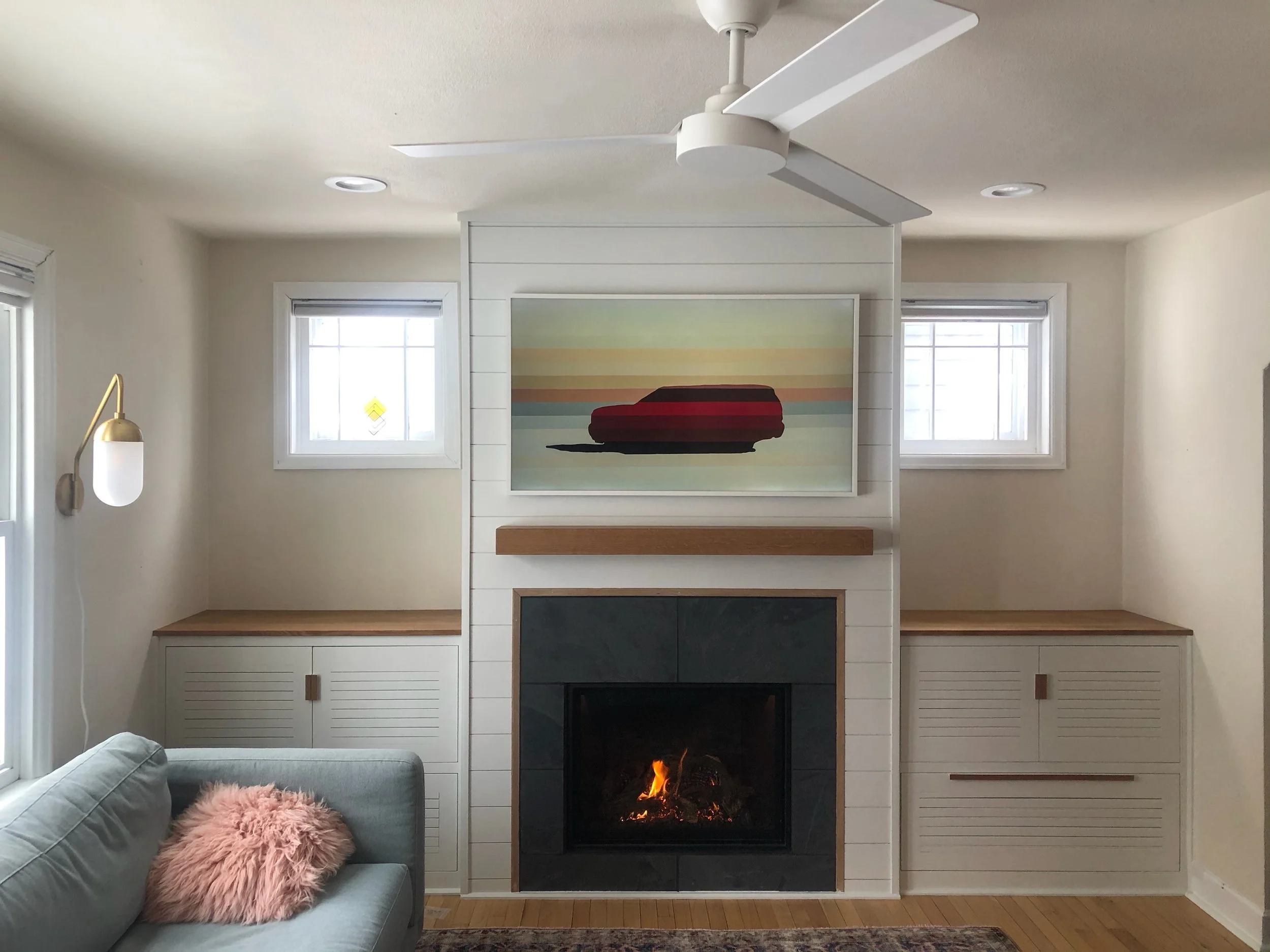 Clients on the East Side of Madison asked me to complete the space around a new gas fireplace. The job included shiplap, cabinets, tile, mantle, and trim work. Quarter sawn white oak, painted soft maple, slate tile.